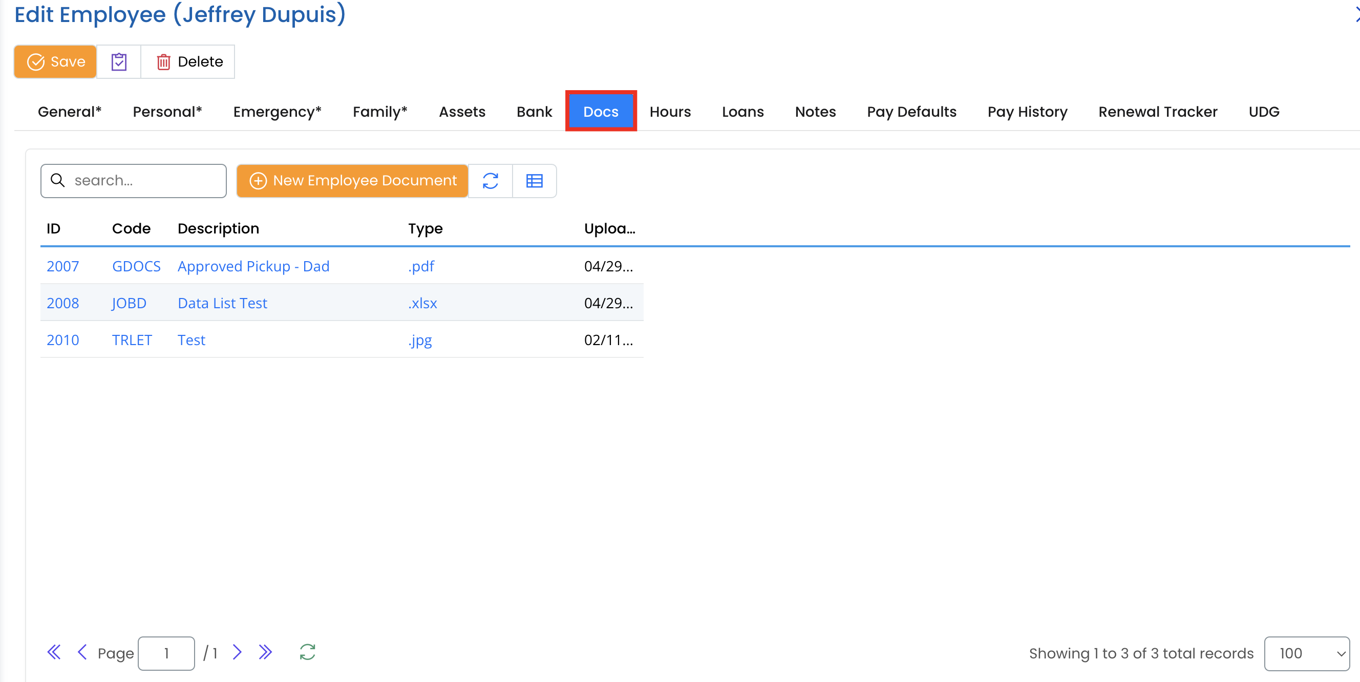 - The document will now appear in the Docs tab list with its corresponding ID, Code, Description, Type, and Upload Date.