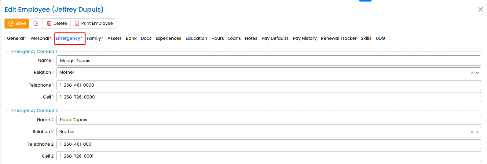 Each employee can have multiple emergency contacts. The system allows for at least two emergency contacts.
