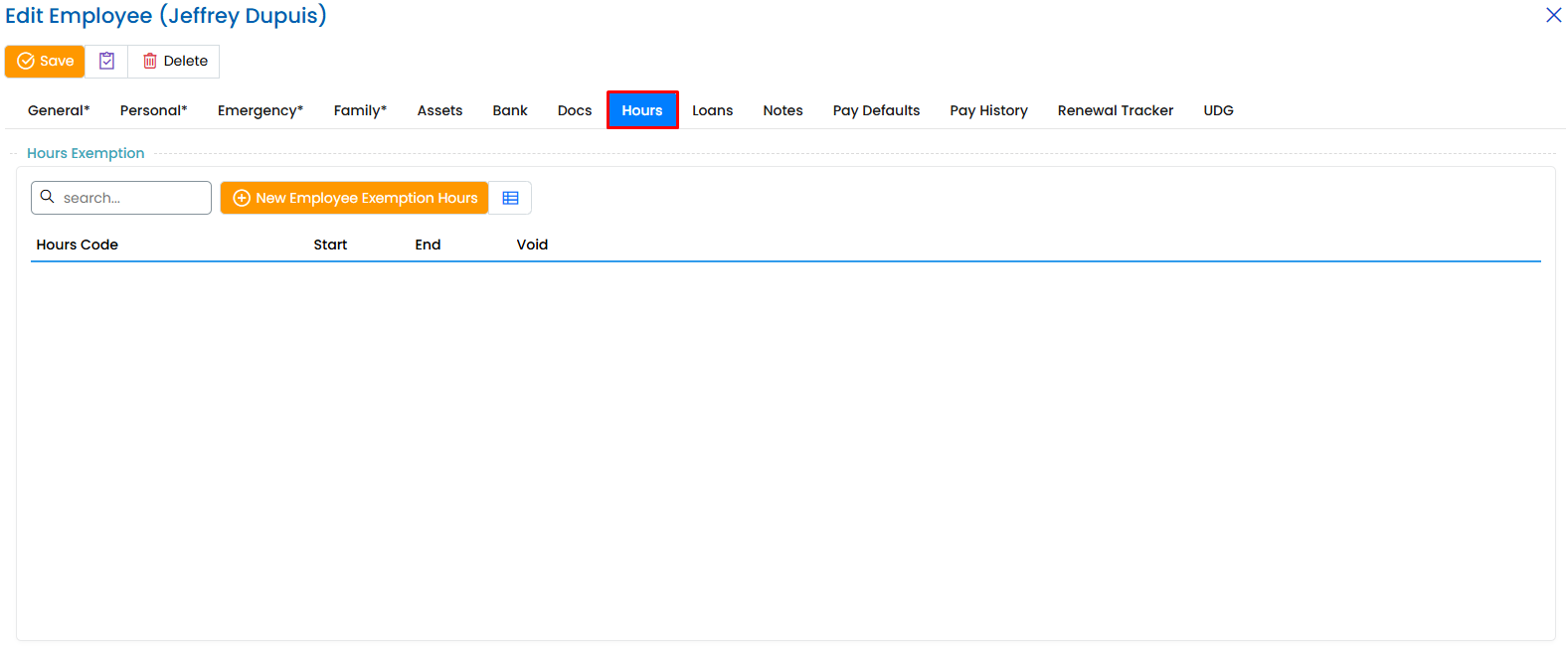 - Click the “New Employee Exemption Hours” button.