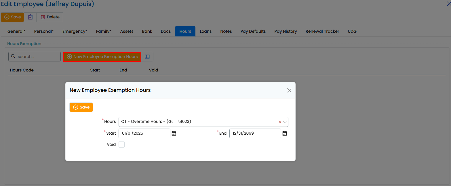- A pop-up window titled "New Employee Exemption Hours" will appear.