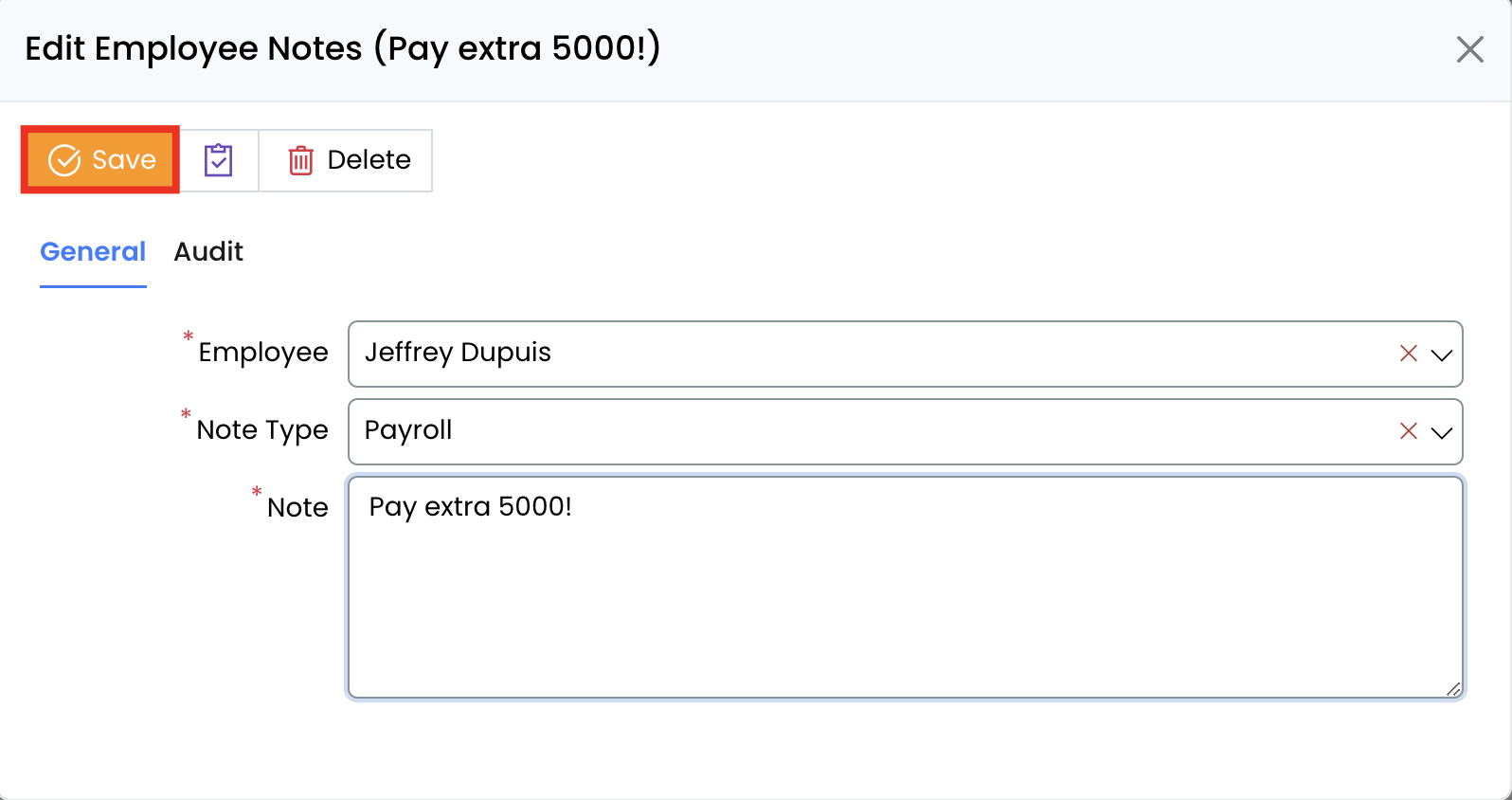 - Type: Specify the category of the note (e.g., General, Medical, Payroll, etc.).