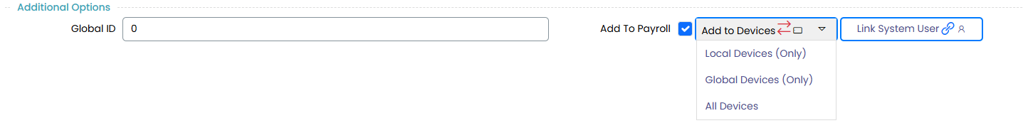 - Add to Devices: If using biometric or attendance tracking, click the dropdown to assign devices.