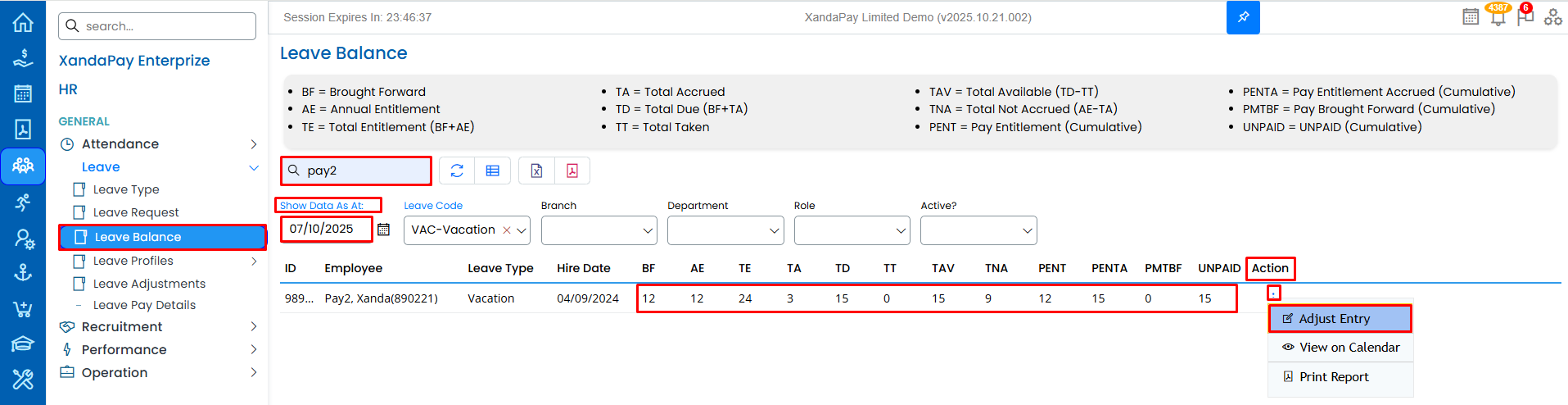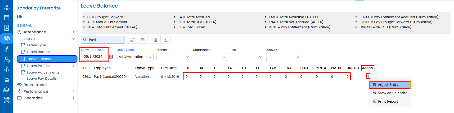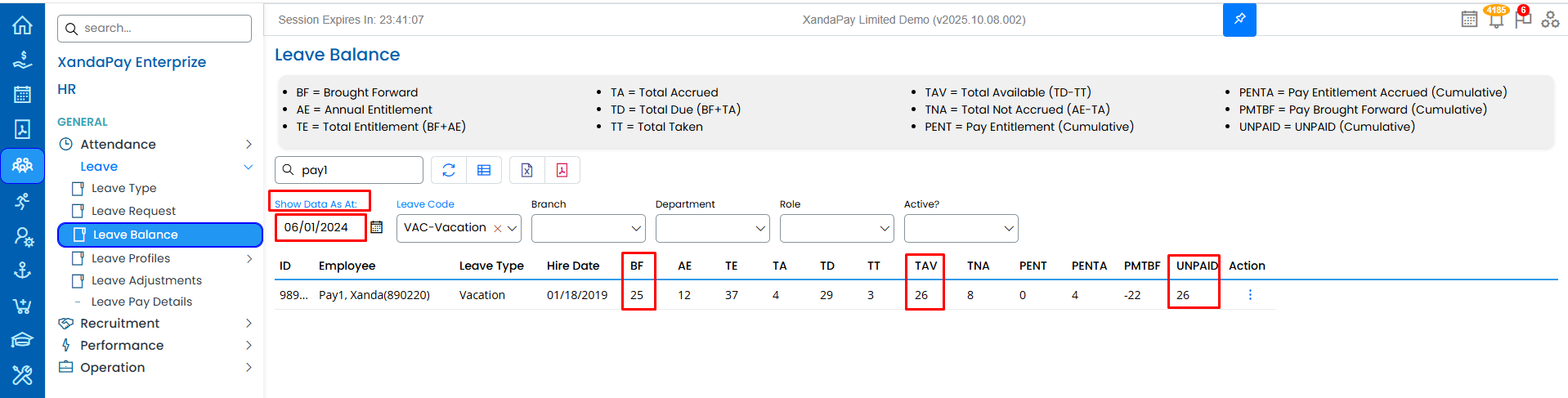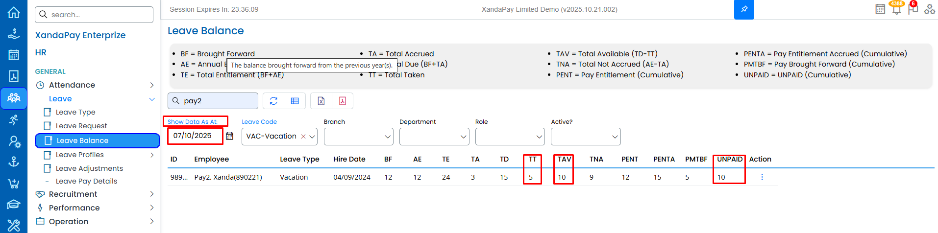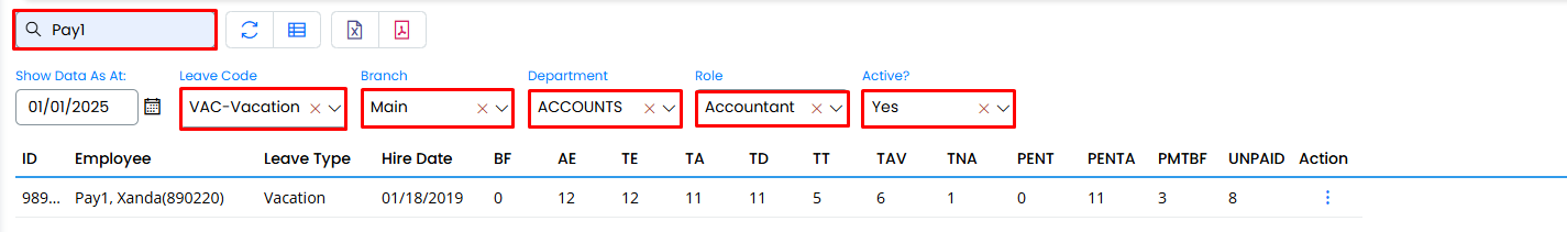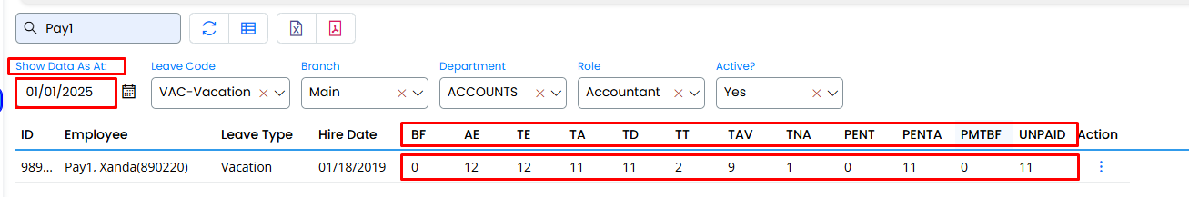 - Use the Show Data As At filter to view the leave balance as of a specific date.