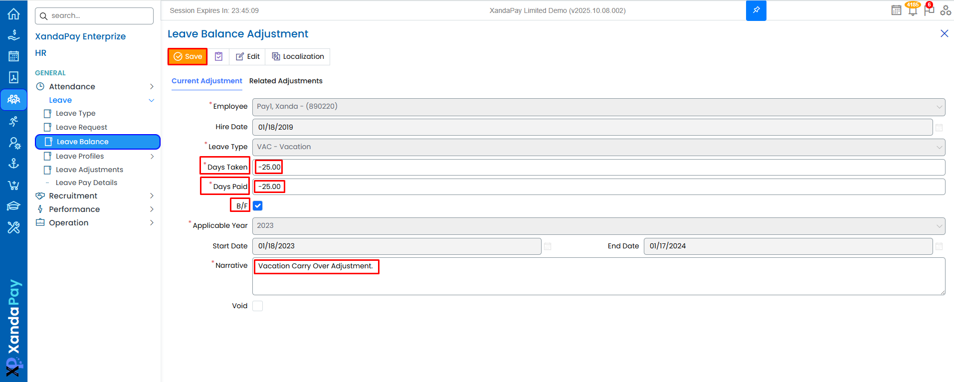 Enter the number of days BF as (–) in the adjustment, it will add these days to the employee’s balance.