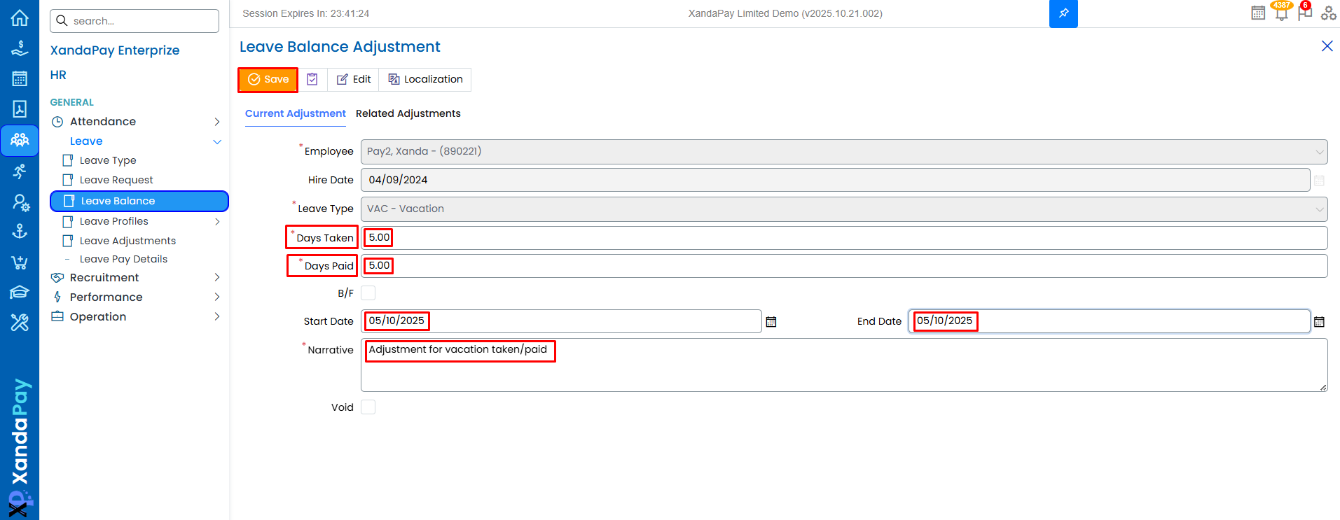 - Update Days Paid: Enter total days paid.Use positive number if the leave was already taken.