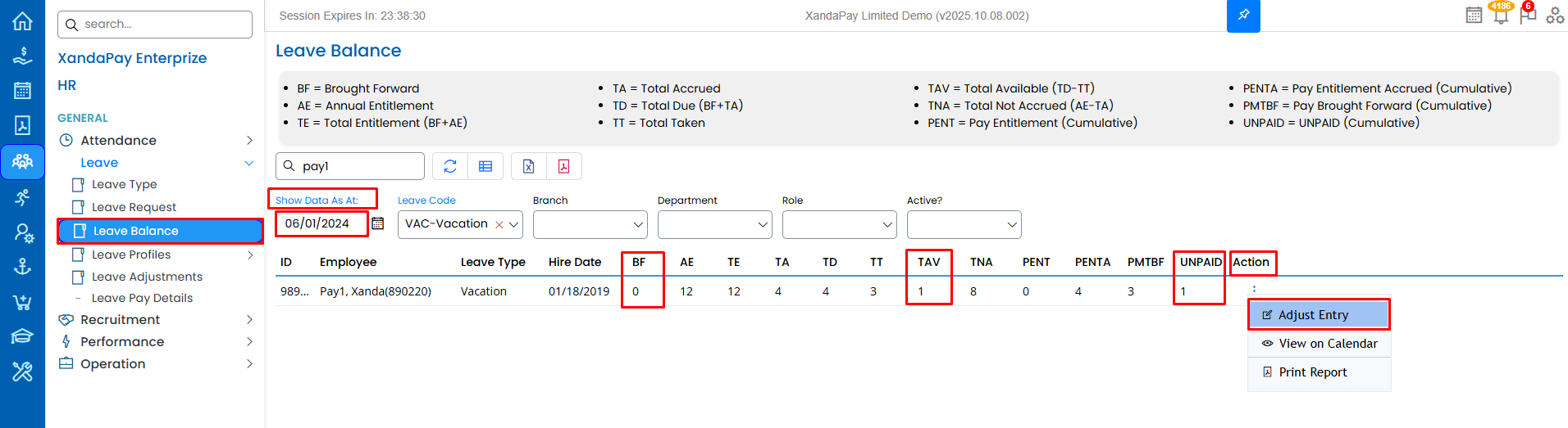 When compared with the previous image, you will notice that the BF value has been updated, which in turn adjusted the Total Entitlement (TE). The Total Due (TD) was automatically recalculated as BF + TA, and the Total Available (TAV) was updated automatically to 26 (TD – TT).