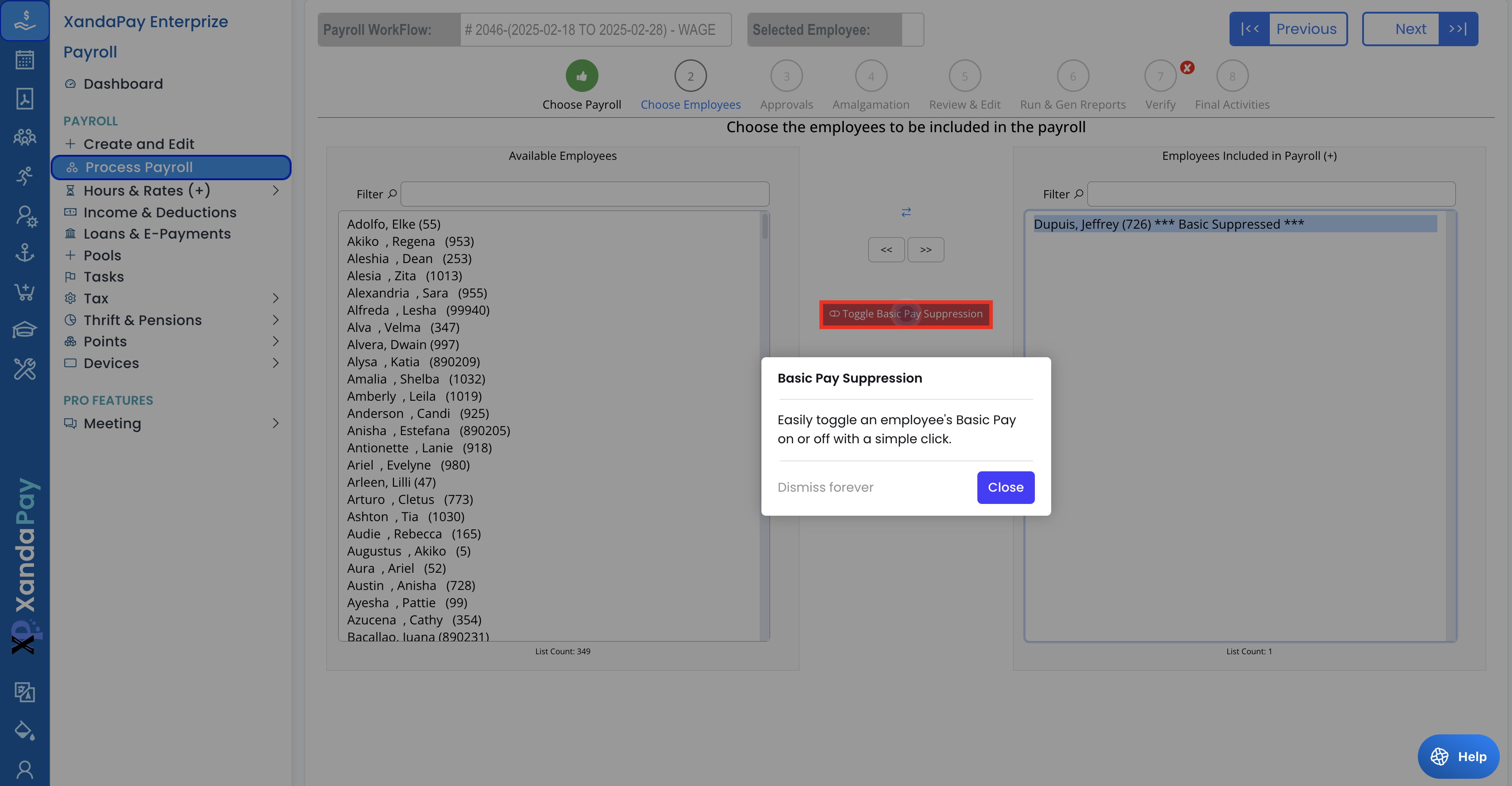 - If needed, click Toggle Basic Pay Suppression to toggle the employees basic pay on or off.