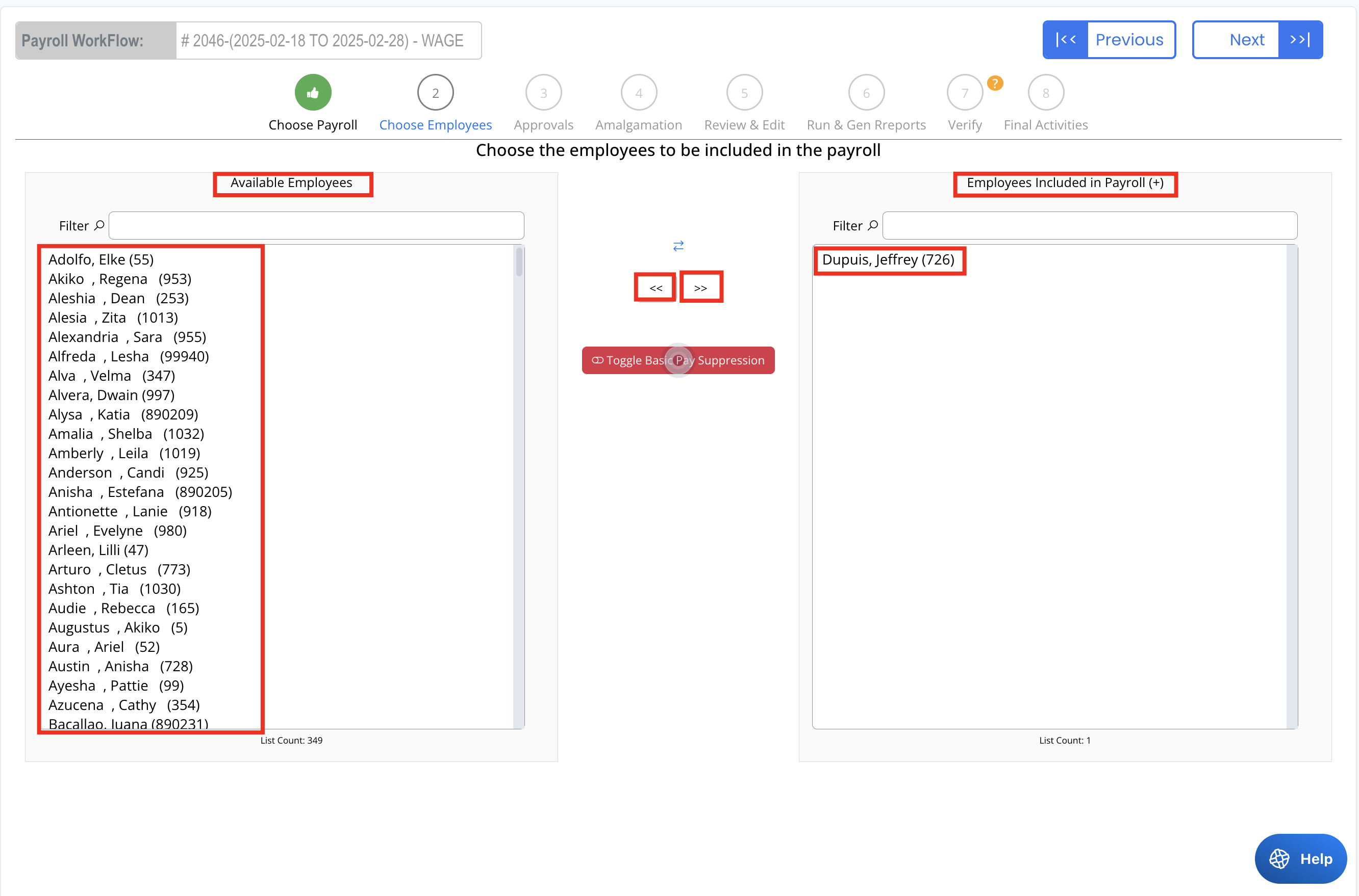 - Use the << button to remove employees from the payroll.