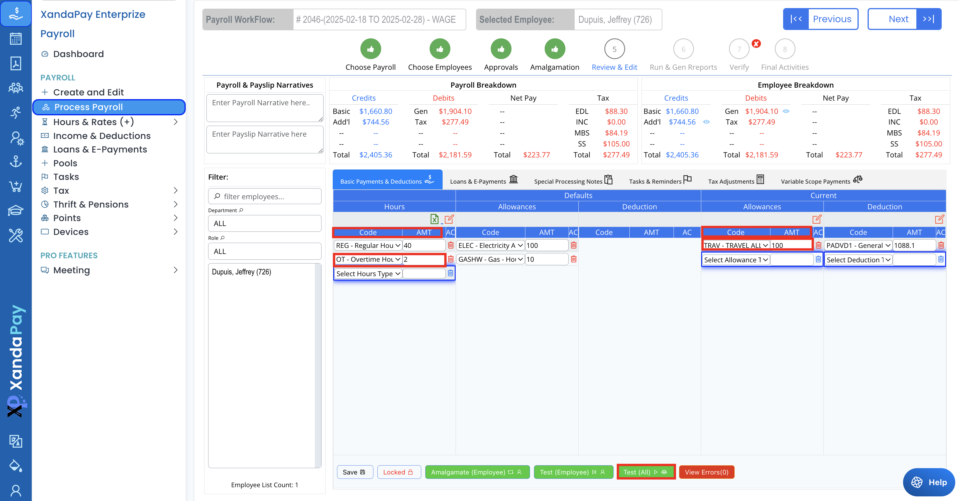 - Use the Test (Employee) or Test (All Employees) button to recalculate payroll after making changes.